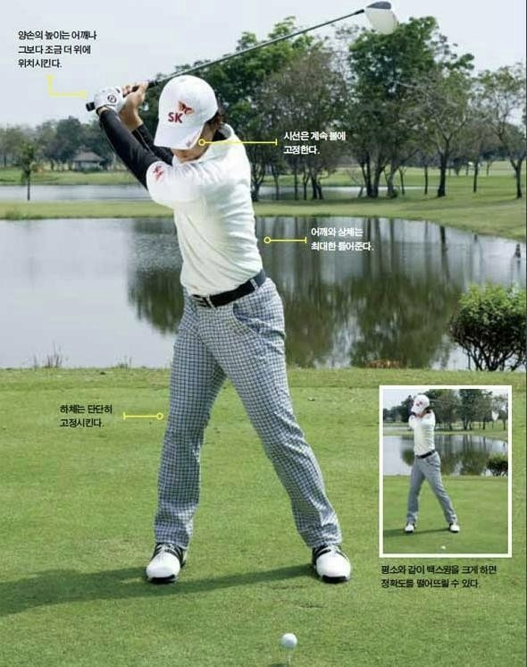 3/4 정도의 백스윙이 적당합니다. 3/4 백스윙은 보통 양손의 높이가 어깨나 그보다 조금 더 위에 위치하게 됩니다. 3/4 백스윙에서는 어깨와 상체는 가능한 한 끝까지 틀어주면서 팔의 높이는 줄이고, 하체는 단단히 고정해야 한다는 것을 기억해야 합니다. 몸이 뒤집히지 않도록 주의합니다.