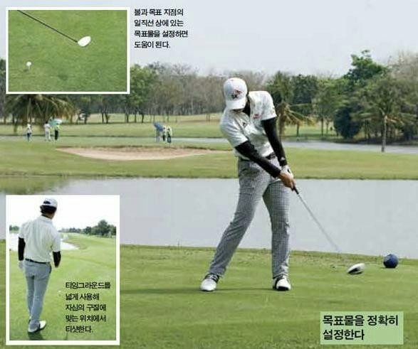 그보다는 최대한 넓게 활용해 자신에게 유리한 지점에서 티샷해야 합니다. 또한 목표 지점을 설정한 뒤에는 볼과 목표 지점의 일직선상에 있는 한 지점을 설정해 그곳을 향해 스윙한다면 보다 좋은 결과를 얻을 수 있을 것입니다.