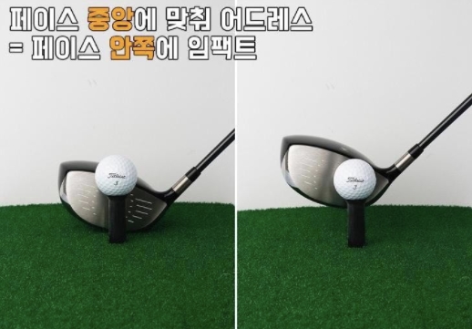 헌데 드라이버를 지면에 놓고 어드레스 할 때 페이스 중앙에 맞춰놓으면 임팩트시에는 헤드가 지면 위로 올라오며 스위트 스폿이 아닌 안쪽으로 임팩트가 이루어집니다.